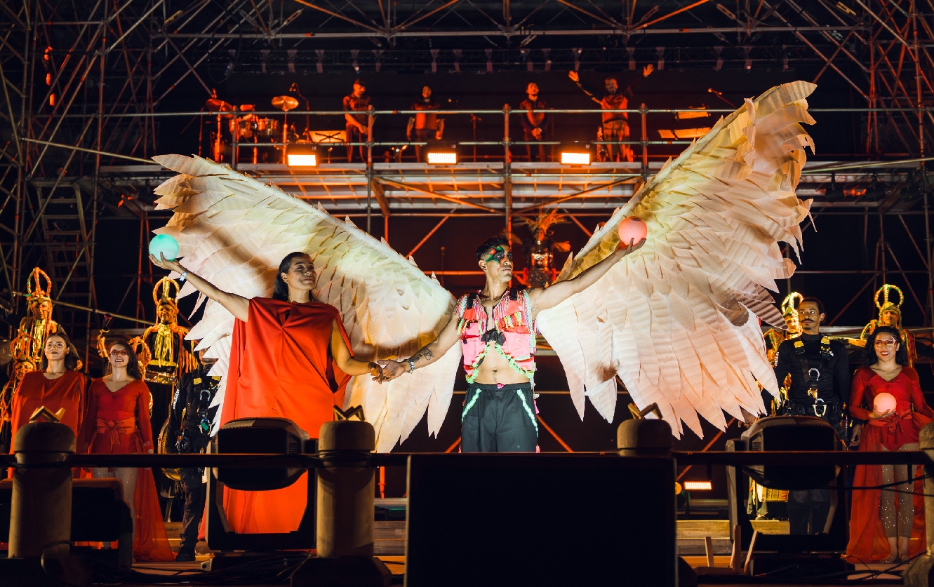 El montaje audiovisual y performático ofreció a los asistentes un viaje simbólico por la identidad de Bogotá en el que cuatro arquetipos guiaron la experiencia: la Guardiana de la memoria, el Ángel de los sueños, la Cuidadora de vida, y el Ángel de la calle. Cada figura representó valores y emociones que construyen la esencia de la capital, invitando a reflexionar sobre su pasado, presente y futuro.